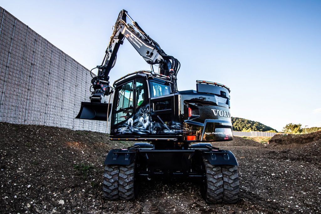 Jetzt fanden zwei neue Bereiche zueinander. Der VOLVO Baumaschinen Händler Robert Aebi GmbH und sein Kunde Mario Schmidt Bagger-Pflasterarbeiten, Garten- Landschaftsbau kamen gemeinsam auf den Truckstyling-Experten zu, ob dieser auch einen VOLVO Bagger verschönern könnte. Zuvor betreute HS-Schoch die beiden Kunden bereits separat mit verschiedenen Anbaugeräten für Robert Aebi – ganz aktuell wieder ein Löffelpaket, bestehend aus mehreren Tief-, Graben- und Profiltieflöffeln – sowie Edelstahl-Zubehör für den VOLVO Truck von Mario Schmidt. Nun also ein komplettes Styling für einen Bagger. Natürlich übernahm HS-Schoch diesen Auftrag und stellte als Erstes den Kontakt zum Airbrush-Künstler Gerd Suchalla her, welcher der Baumaschine einen tollen Anstrich gab.